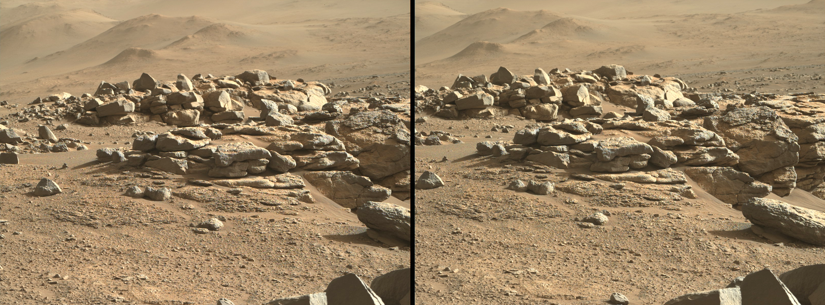 Якщо у вас є бажання побачити Марс на власні очі, ніби ви опинилиись поруч з ровером “Curiosity”, це можна здійснити прямо зараз, навіть не відходячи від вашого монітіру. Зробити таке дуже легко за допомогою фотографій червоної планети, що були отримані лівою та правою камерами “Mastcam-Z” марсоходу, які знайдете нижче. Але спочатку для тих, хто не має досвіду у розгляданні стереоскопічних зображень, моя порада: подивіться коротеньке (1:50 хв.) відеоролік, у якому пояснюється, як досягти бажаного ефекту. Щоб полегшити собі задачу, відкрийте зображення у новій вкладці та натисніть F11.