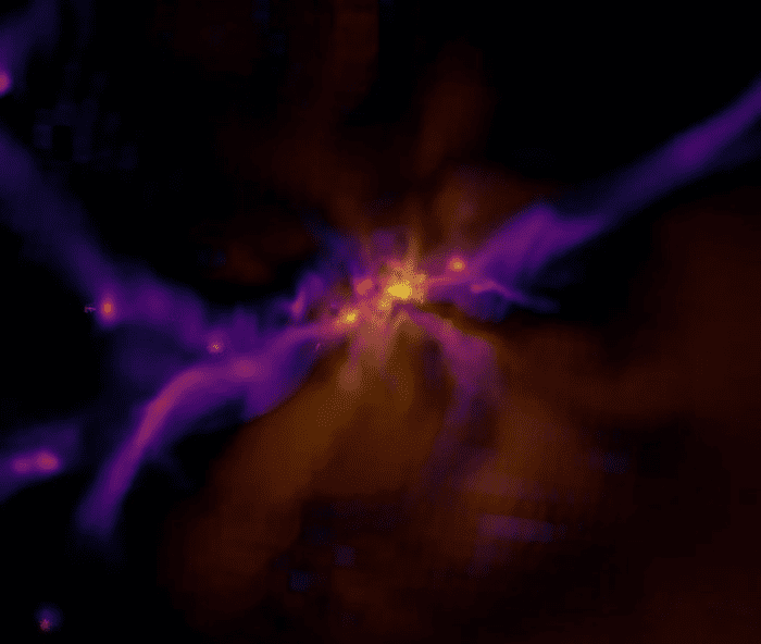 Снепшот еволюції галактик та зірок за декілька сотень мільйонів років після Великого вибуху (зображення взяте з симуляції). Галактичні волокна газу позначені пурпуровим, сяйво зірок – білим, а високоенергетичне випромінення з наймасивніших зірок – жовтим. Credit: Harley Katz, Beecroft Fellow/Univ. Oxford