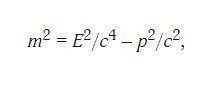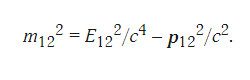 Если же использовать формулу на рисунке 1 к задаче столкновения двух частиц, то в результате с учетом законов сохранения мы получим достаточно интересную величину (смотри рисунок 2), которая называется инвариантной массой. Из векторного закона сложения импульсов частиц становится понятно, что эта величина характеризует энергию столкновения и совсем не обязательно равна сумме масс сталкивающихся частиц (может быть и больше них). Используется эта величина в основном при анализе энергетических спектров частиц на ускорителях.