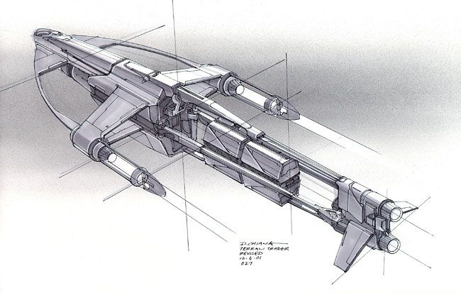 Кроме полноцветных детализированных иллюстраций, Чанг большой мастер скетча, который отлично передаёт идею и конструкцию придуманного корабля, робота или интерьера. Это скорее техническая иллюстрация. Кстати, очень по стилю похожа на скетчи Даниэля Саймона (статья о его работах), или скетчи Саймона похожи на скетчи Дуга Чанга. Думаю, тут ни кто ни у кого не подсматривал, точнее подсматривали все у всех, в 90-х такой стиль был популярен.
