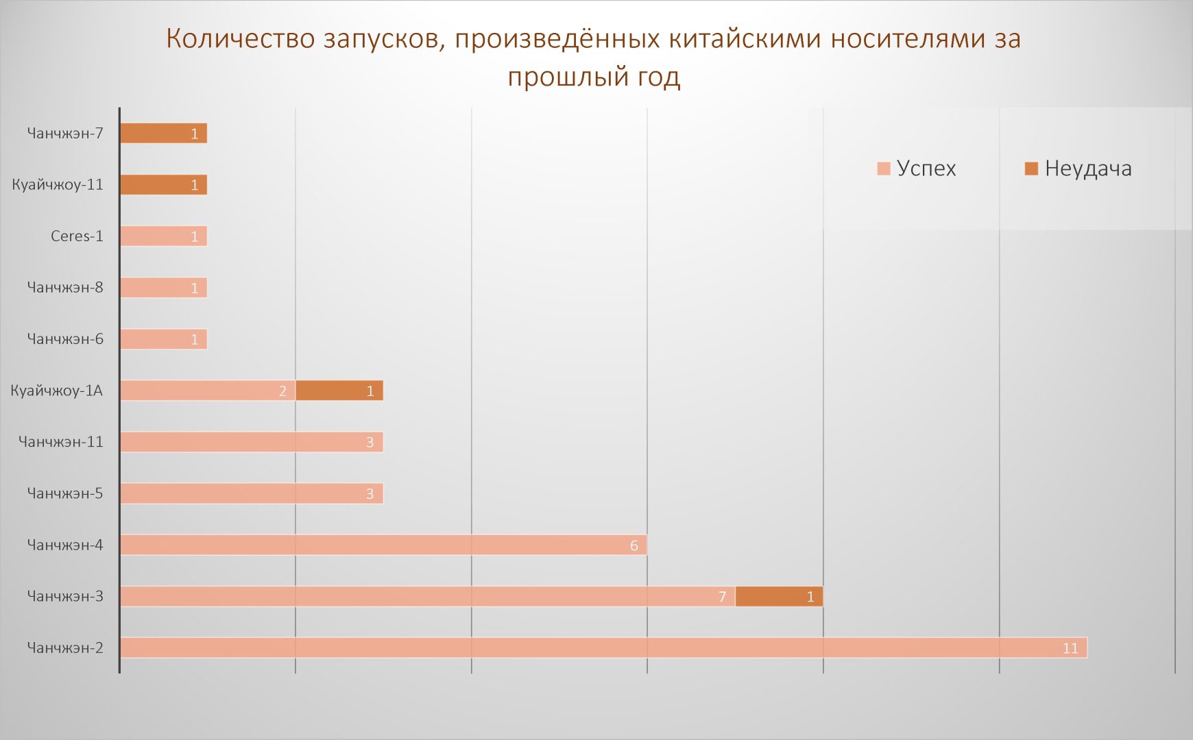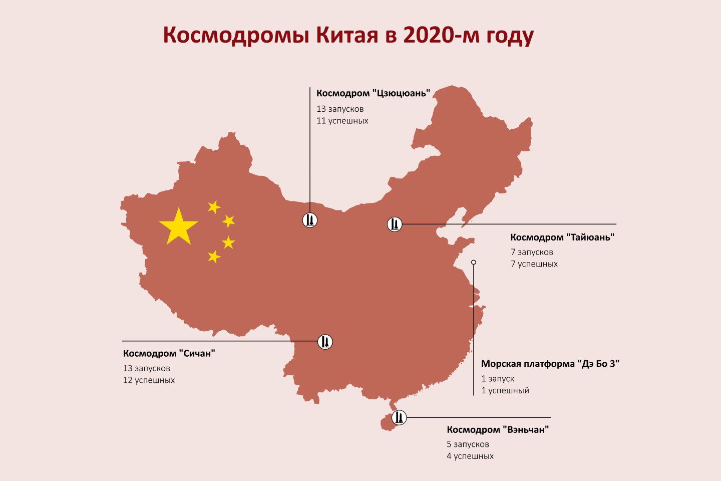 Рабочие лошадки Поднебесной – ракеты “Чанчжэн-2”, “Чанчжэн-3” и “Чанчжэн-4” в различных модификациях. На троих данные носители “сообразили” почти ⅔ всех прошлогодних стартов Китая. При этом наиболее загруженными космодромами оказались “Сичан” и “Цзюцюань”, на долю каждого из которых пришлось по 13 запусков. С наглядным представлением о ракетно-пусковой деятельности Поднебесной вы можете ознакомиться чуть ниже.