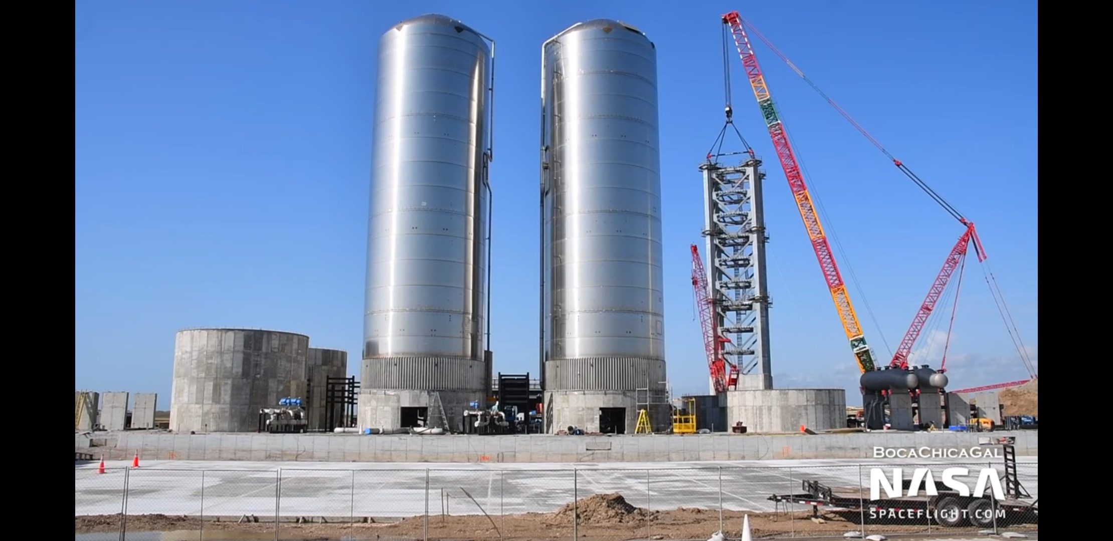 Первые установленные баки (GSE1 и GSE2). На заднем плане Frankenkrane устанавливает 3ю секцию башни. Credit: NasaSpaceFlight.