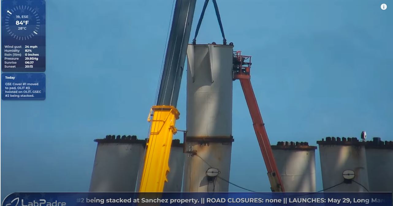 В целом, несмотря на отсутствие видимой подготовки к новым испытаниям, темпы поддерживаются очень высокие. Да ведь и такое испытание, как запуск на орбиту, требует наличия орбитального пускового комплекса, а именно на его строительстве сейчас и сосредоточены основные усилия в Техасе. И хотя собираются, преимущественно, топливные баки GSE, а так же их внешние оболочки (одну из которых уже доставили под конец мая), из недр ангаров эпизодически появляются различные детали. К примеру, носовые обтекатели, парочку из которых удалось заснять в середине месяца.