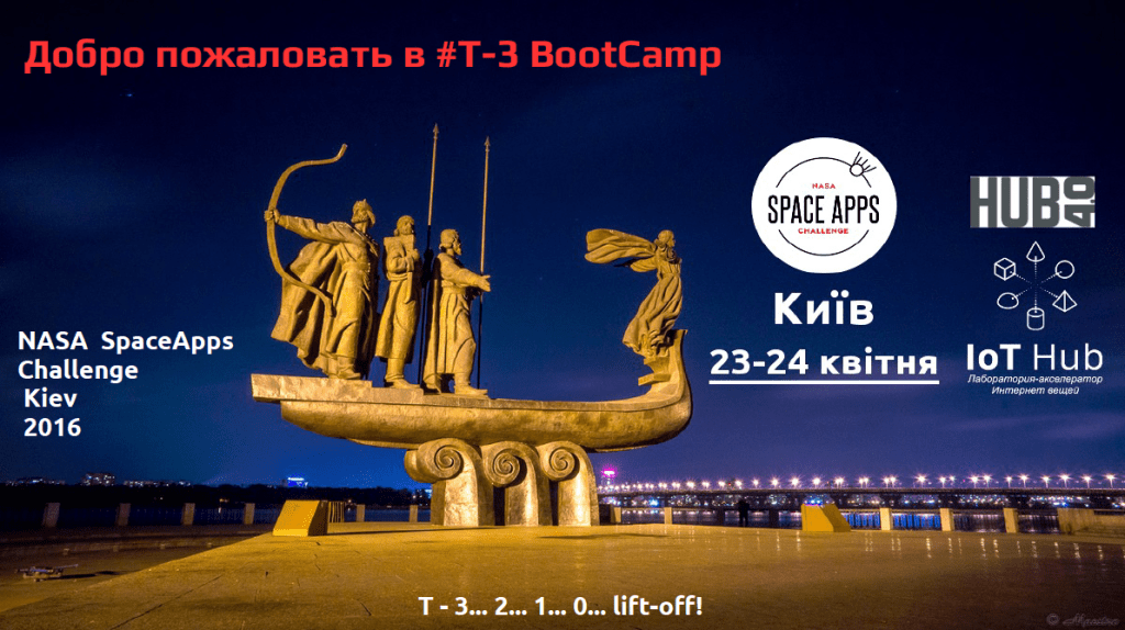 2 апреля, в коворкинге HUB4.0 на Подоле в рамках встречи T-3 Bootcamp, собрались любители космоса и специалисты разных направлений. Тренировочный лагерь является своего рода подготовкой к первому киевскому хакатону NASA International SpaceApps Challenge. Т-3 в названии, как обьясняют сами организаторы (Т минус 3), означает, что 3 недели осталось до хакатона.