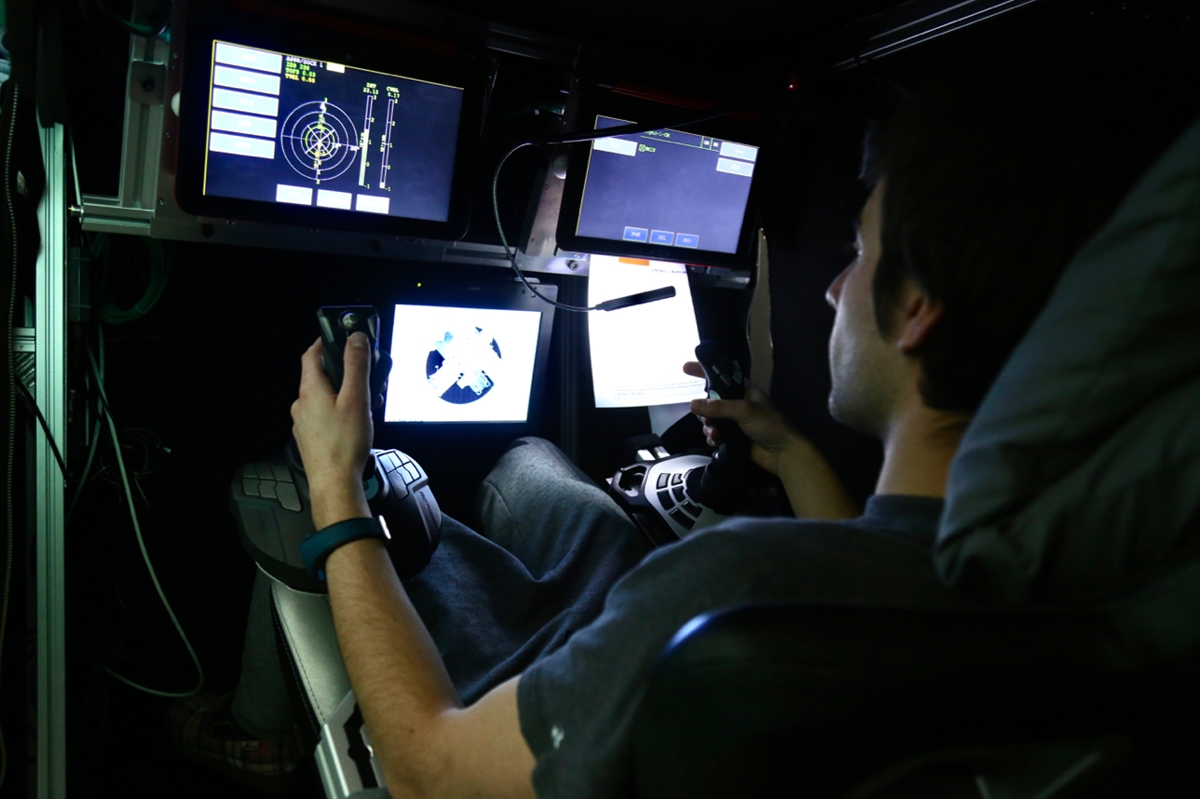 Человек на этом изображении принимает участие в проекте SimSkill, который исследует, как часто астронавты должны тренироваться, чтобы поддерживать свои навыки пилотирования во время длительного космического полета. После первого тренинга участники делятся на две группы: одна «летает» один раз в месяц, а другая группа проходит курсы повышения квалификации один раз каждые три месяца в течение их зимнего пребывания в Антарктике.