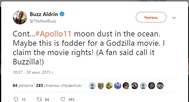 Это дало ему повод отпускать шуточки по поводу Годзиллы, которая могла завестись в океане именно из-за лунной пыли и вдохновить создателей фильма. В его твиттере комментаторы тут же назвали зверя Buzzilla.