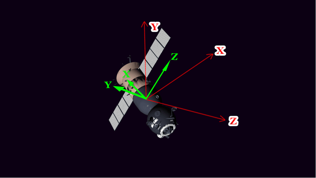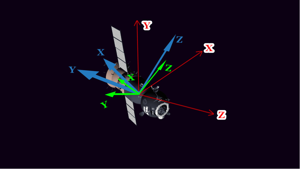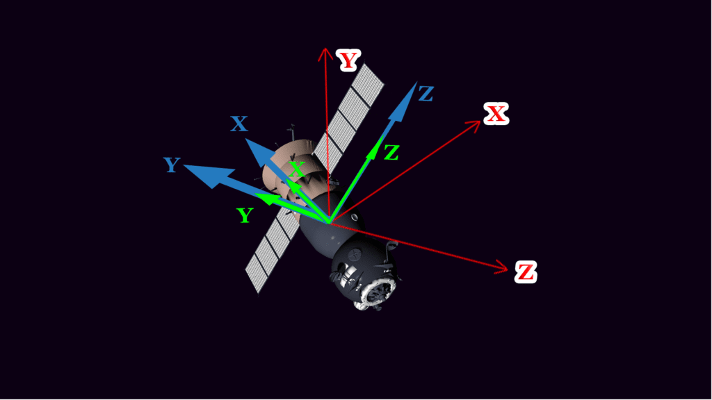 Конечной задачей при построении любой ориентации, включая ОСК, является совмещение СВЯЗАННОЙ системы координат с ОПОРНОЙ. При прочтении последнего предложения у вас наверняка появился вопрос: зачем тогда нужен посредник в виде ПРИБОРНОЙ системы координат? Вся соль в том, что однажды выставив ПРИБОРНУЮ систему координат по осям ОПОРНОЙ, её математическая модель заносится в бортовую вычислительную систему (БВС). А так как особенностью орбитальной системы координат (ОСК) является ее предсказуемое вращение, то её модель позволяет определить как повернуть корабль, чтобы получить ориентацию в ОСК в любой точке орбиты.