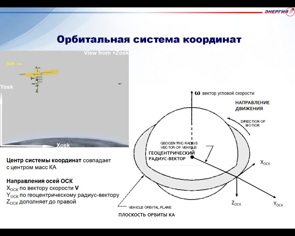 Как только динамическая задача ориентации была решена (СВЯЗАННАЯ система координат совмещенная с ПРИБОРНОЙ) началось решение кинематической задачи ориентации. По сигналам из инфракрасной вертикали (ИКВ) приборная система координат вместе со связанной начали свое путешествие к осям ОПОРНОЙ системы координат. Кстати у меня есть догадка, что ПРИБОРНАЯ получила свое название как раз потому, что изменяет своё положение в зависимости от показаний приборов ИКВ или солнечного датчика. Сегодня мы рассматривали орбитальную систему координат (ОСК).