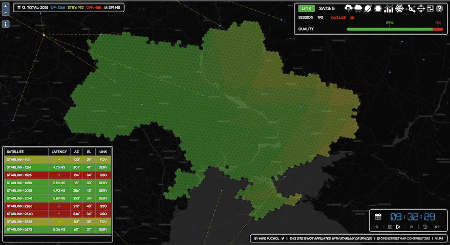 На снимке экрана Starlink Coverage Tracker, предоставленном Майком Пухолем, показано цветовое представление потенциального покрытия, а зеленым цветом показаны области, которые лучше обслуживаются несколькими спутниками. ВАШИНГТОН — Ссылаясь на глушение Starlink «вблизи зон конфликта», Илон Маск 5 марта заявил, что SpaceX «изменит приоритет...